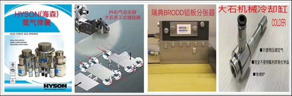 本公司是HYSON氮氣彈簧在中國的總代理,并提供管路設計及售后服務。同時還代理美國PHD氣動夾鉗、SWEDEN機器人平衡缸、美國LSP噴涂系統(tǒng)、法國PRONIC模內(nèi)攻絲機等。另外,本公司還提供多工位模具自動化端拾器產(chǎn)品,從設計、制造、運輸、安裝、調試為客戶提供整套“交鑰匙”工程。